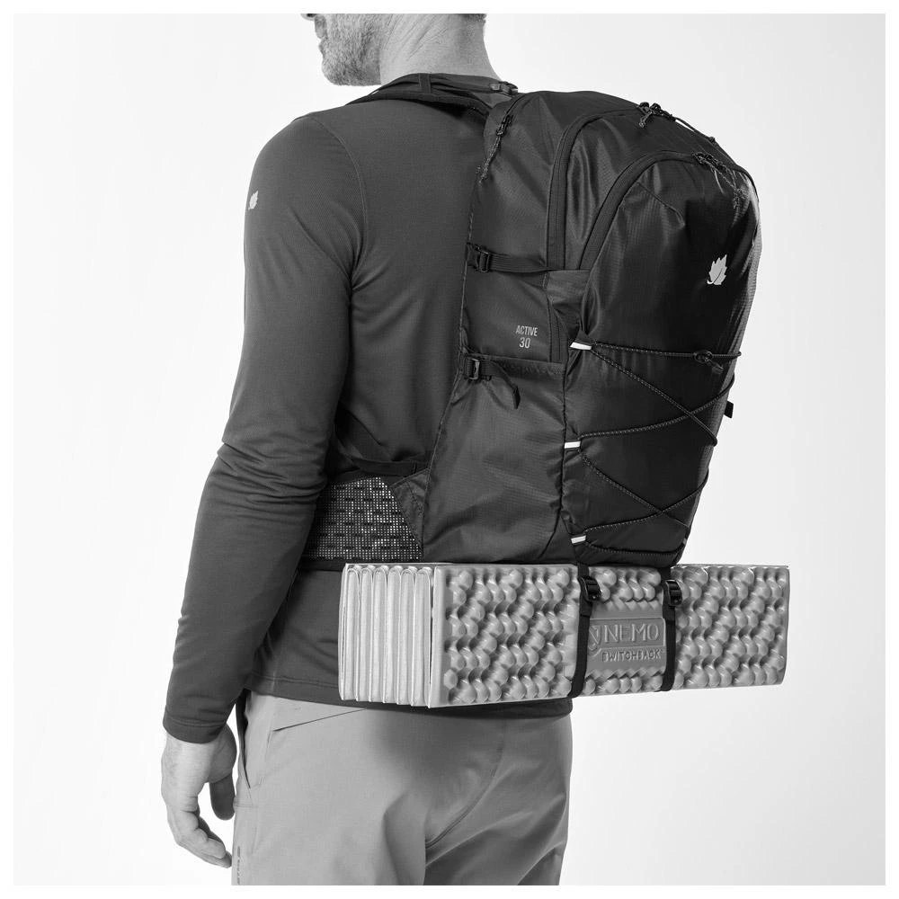 Avec son volume de 30 litres et sa légèreté, l’Active 30 de Lafuma est un sac à dos développé pour vous accompagner pour des randonnées à la journée ou éventuellement sur un week-end avec des nuits en refuge. Il est en effet doté d’un dos en mousse EVA confortable et de bretelles ergonomiques. Selon la charge que vous transportez, vous pourrez ajuster le volume avec les sangles de compression latérales. Il est doté de rappels de charges aux bretelles, d’une sangle poitrine et d’une ceinture abdominale. Cette dernière est équipée d’une poche zippée pratique. Lorsque vous n’aurez plus besoin de vos bâtons, vous pourrez les accrocher au porte-bâtons présent sur le sac. La matière utilisée est en polyester qui bénéficie d’une imperméabilité et d’un traitement déperlant durable sans PFC afin de protéger vos affaires de l’humidité en cas de légère averse.